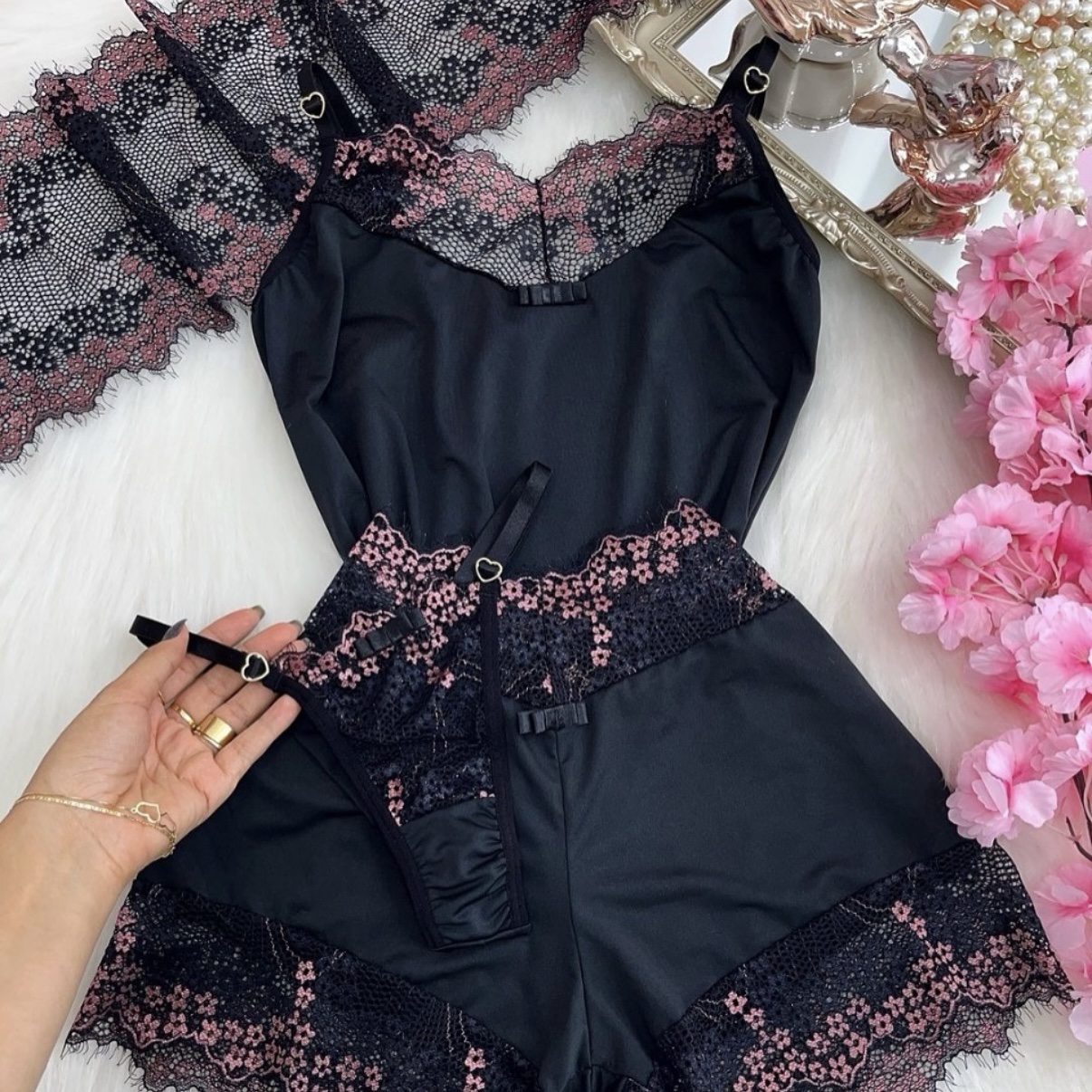 BABYDOLL ENCANTO NEGRO CON ROSA